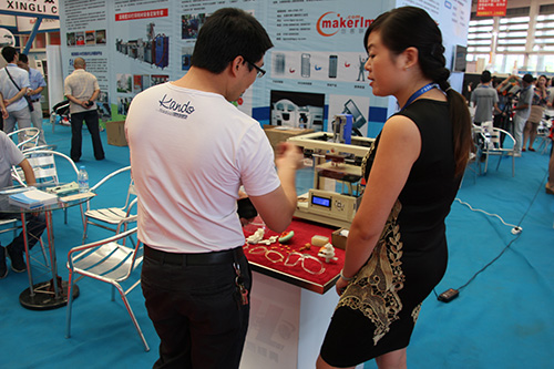 記者留意到,由創(chuàng)客聯(lián)盟帶來的“3D巧克力打印機”無疑是3D打印特裝區(qū)、乃至整個展會的“明星產(chǎn)品”。據(jù)了解,展臺上的這臺于2014年9月份生產(chǎn)的3D巧克力打印機,是目前中國國內(nèi)推出的第一臺以3D打印技術(shù)為基礎(chǔ)的巧克力打印機,這臺設(shè)備由青島尤尼科公司自主研發(fā)生產(chǎn),“很多人認為3D打印技術(shù)高不可及,但它的產(chǎn)品已確確實實地來到了我們的身邊,來到了我們的生活當中?!眲?chuàng)客聯(lián)盟工作人員給記者介紹了3D巧克力打印機的使用方法:“首先在機器投放巧克力粉,然后在電腦設(shè)計你需要的產(chǎn)品圖案,將設(shè)計方案輸入到該3D打印機,機器會通過3D打印技術(shù)自動將你的2D設(shè)計方案立體化生產(chǎn)。工作人員說:“以前,在傳統(tǒng)蛋糕店只能用奶油給客戶在蛋糕上手寫名字,在市面上售賣的巧克力也是批量生產(chǎn),缺乏特色,但通過3D巧克力打印機,家長可根據(jù)小孩子的喜愛,隨意塑造任何字體和圖案,打造一份屬于自己的巧克力,是真正做到定制生產(chǎn)的概念。”此外,創(chuàng)客聯(lián)盟還介紹到,生產(chǎn)商會對買家進行設(shè)計培訓(xùn),買家不需要設(shè)計師也可真正做到DIY巧克力產(chǎn)品制作。