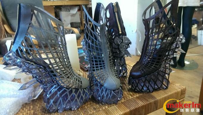 除了這款禮服,荷本還和著名鞋類設(shè)計(jì)師Noritaka Tatehana一起制作了一對充滿個(gè)性的水晶風(fēng)格3D打印鞋,兩名設(shè)計(jì)師使用3D打印技術(shù)和激光切割技術(shù)完成了這一項(xiàng)目。